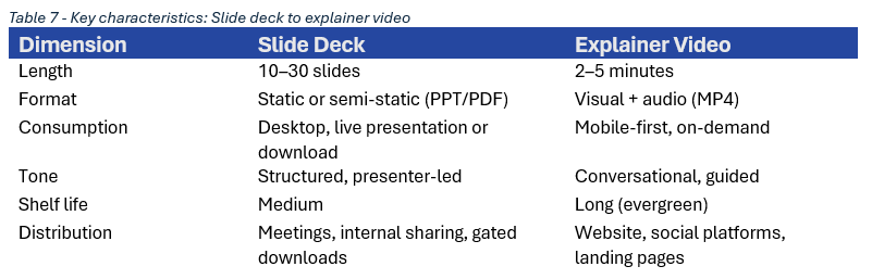 From an operational perspective, the source material has already been researched, structured, and reviewed, which keeps production costs low and compliance workflows predictable. AI can do a lot of the heavy lifting for the repurposing, but final edits and reviews typically require human judgment. Slide decks for webinars can also serve as a foundation for a video, which we cover in a later example.