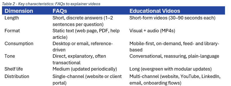 Repurposing FAQs into short educational videos goes further by providing firms a way to standardize a video production workflow and ensure that core concepts are delivered consistently.