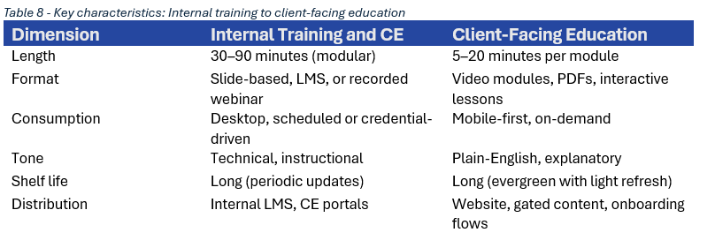Financial firms invest significant time and resources in developing internal training and CE materials to educate advisors, planners, and support staff. Yet much of this content never leaves the organization, even though it addresses the same questions and concepts clients routinely ask.