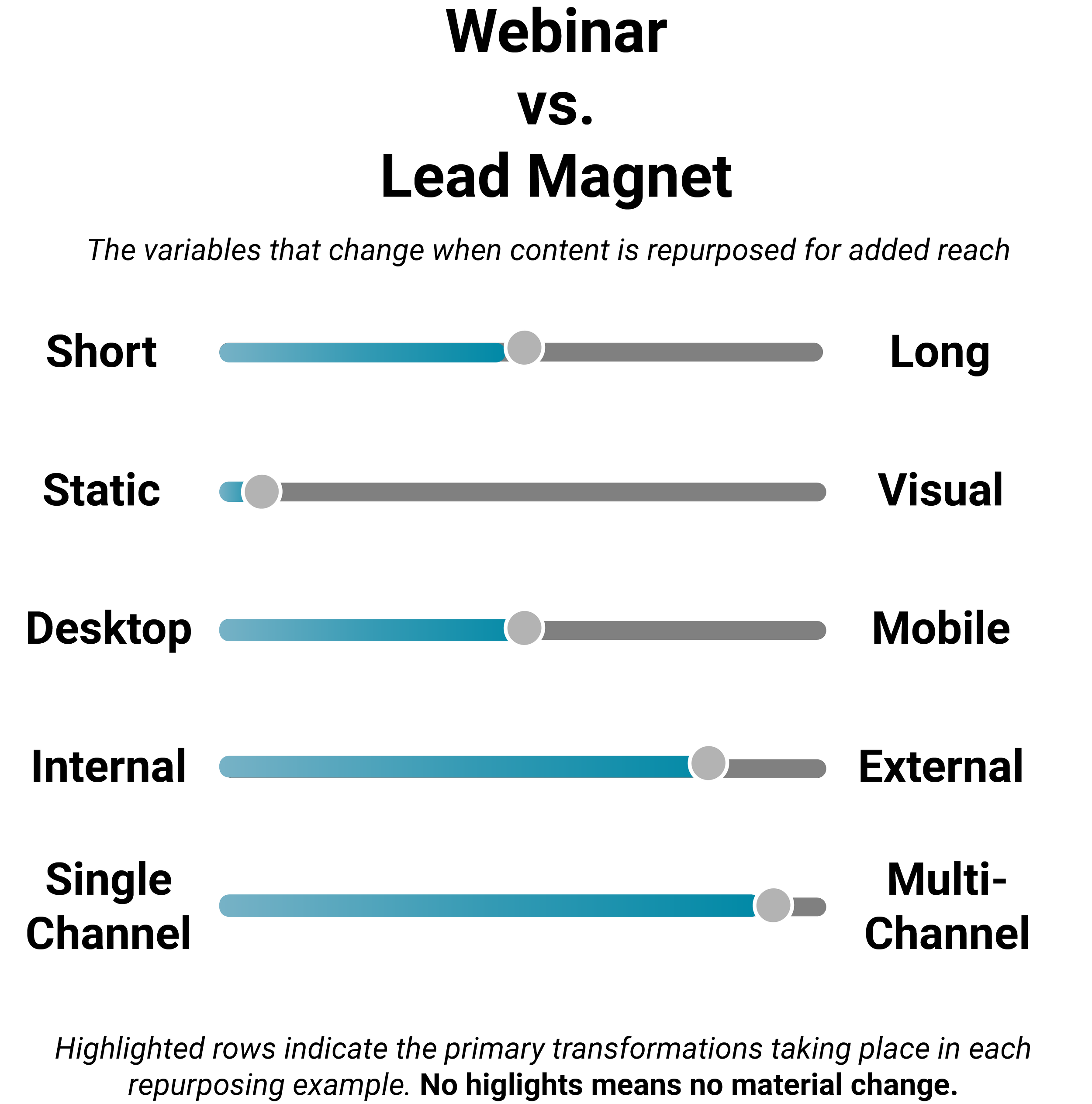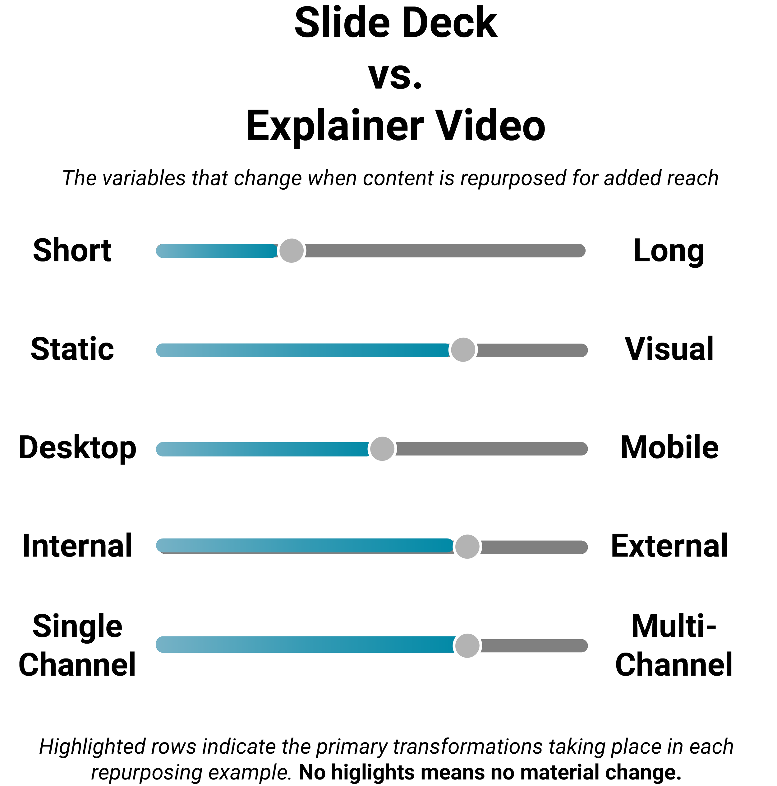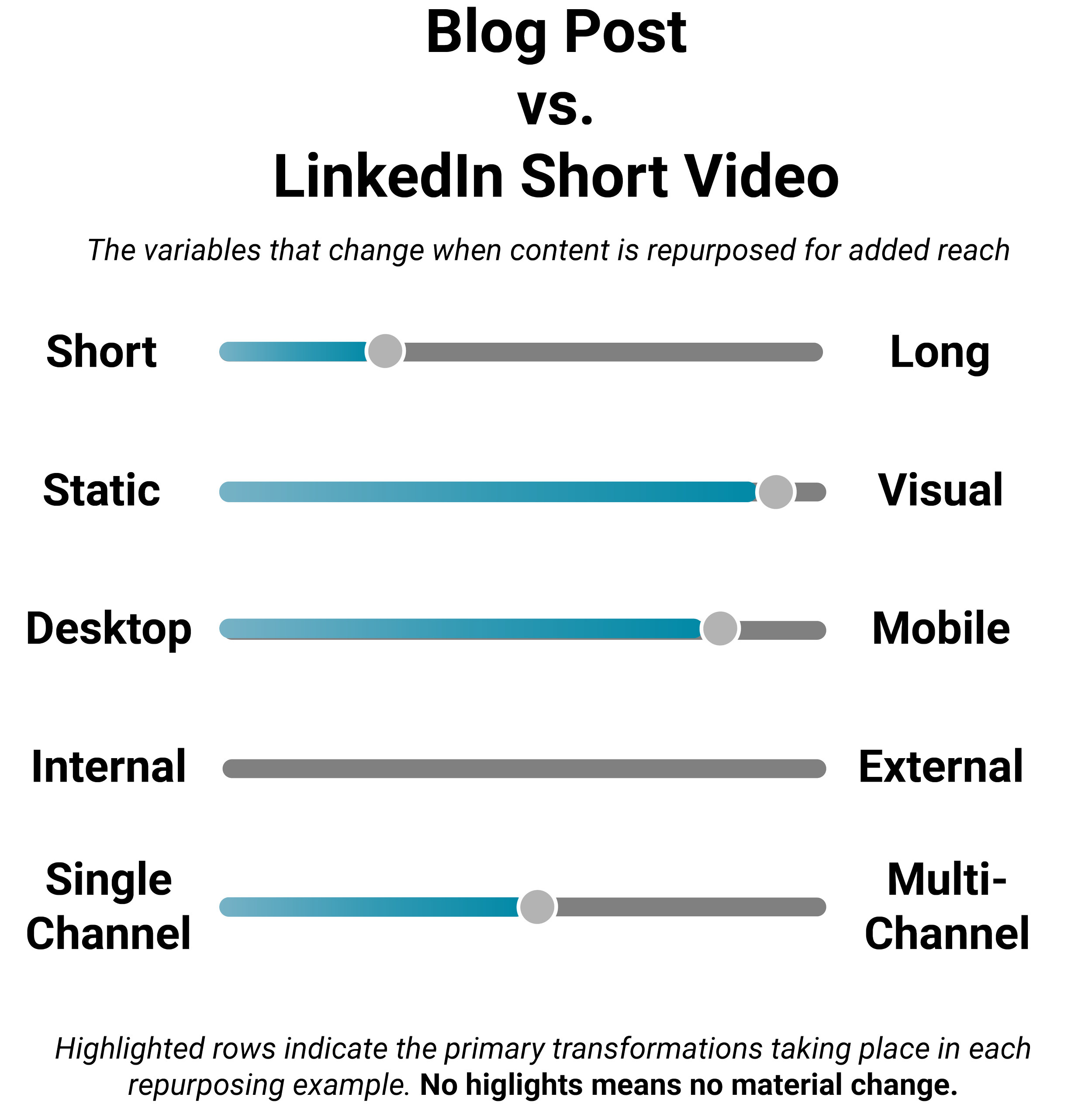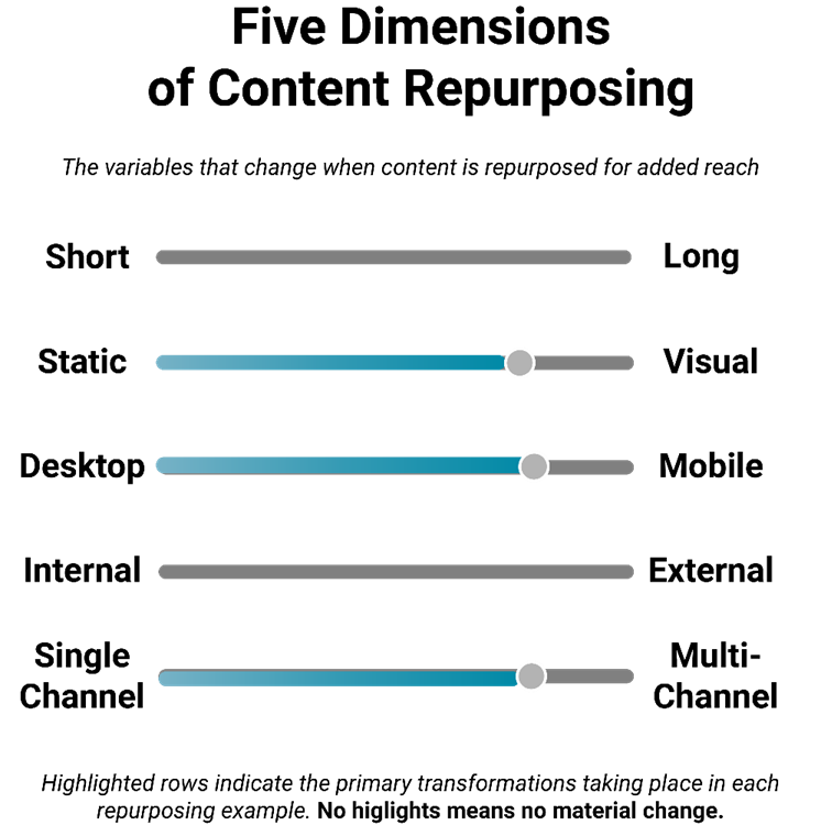 Rather than treating repurposing as an update or refresh, this guide highlights the characteristics that change and why. A visual, such as the one below, appears along with each example, with a bar that’s both blue and gray indicating the primary transformations taking place. For example, converting a blog post to a video would rank heavily in changing a static asset to a dynamic one, from desktop to mobile format, and from single to multi-channel.
